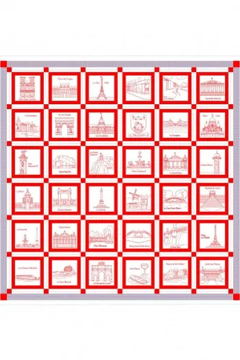 Ce tissu représente 36 monuments ou lieux parisiens dessinés en rouge sur fond coloris écru: Notre-Dame, l’Arc de Triomphe, la tour Eiffel, le Pont Neuf, le Moulin rouge, l’Opéra Garnier, etc., et même la… boutique Sajou ! Chaque dessin comporte un cadre rouge puis des pointillés et, tout autour, se trouve un petit motif imprimé dans les tons bleu, blanc et rouge. L’ensemble forme un motif de 1,50 m sur 1,50 m, le prix correspondant à un motif entier.