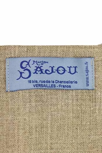 Pochette de serviette à broder en lin naturel 12 fils au cm, bordée d’un biais coloris naturel et revêtue d’une étiquette Sajou bleue.
