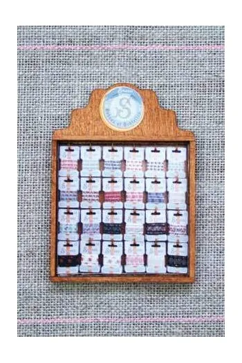 Ce présentoir miniature est la réduction à l’échelle 1/12e du véritable présentoir 24 cartes que nous utilisons pour nos rubans coton. Il est fabriqué en bois de hêtre pourpre, teinté merisier.