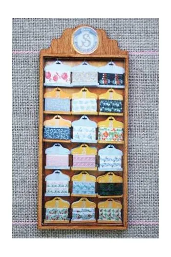 Ce présentoir est la réduction à l’échelle 1/12e du véritable présentoir 18 cartes présentant une sélection de nos rubans larges en coton. Il est fabriqué en bois de hêtre pourpre, teinté merisier.