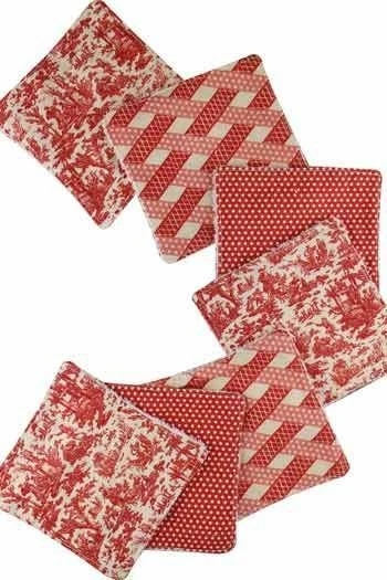 Sept lingettes démaquillantes lavables toile de Jouy rouge et éponge de bambou