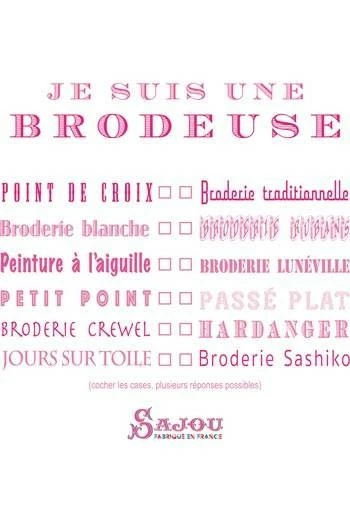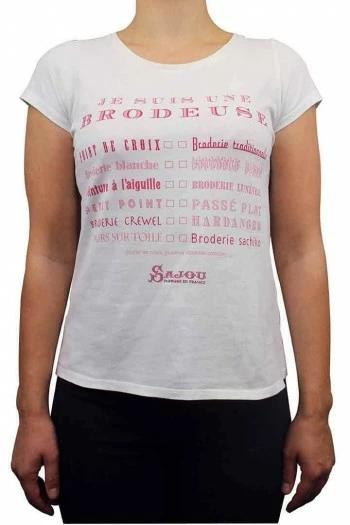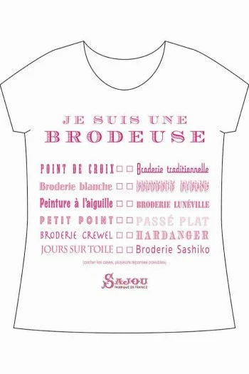 Imprimé en rose fuchsia, ce t-shirt affirme fièrement que vous êtes une brodeuse ! En-dessous du titre, une liste de techniques de broderie, que vous pourrez, si vous le souhaitez, cocher en faisant une croix… avec un point de broderie.