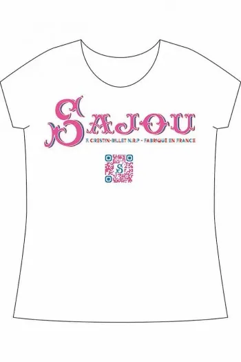 Ce t-shirt est imprimé des deux côtés : sur le devant, Sajou en rose et un QR code renvoyant sur notre site !