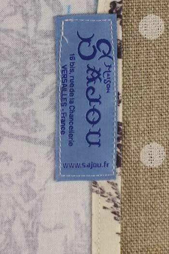 Tissu 100 % coton – Liens 100 % lin – Étiquette Sajou bleue sur un des côtés.