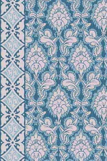 Tissu d’inspiration Renaissance dans les tons marine, bleu ciel et écru. Il s’appelle Damas, car son motif évoque les grands motifs des tissus damassés. Ce tissu a la particularité d’avoir, de chaque côté, une bande d’un motif répétitif différent de celui du centre. Elle mesure 6,5 cm de large. Vous pourrez laisser cette bande telle quelle si vous utilisez ce tissu pour des rideaux, une nappe ou encore un grand plaid. Mais pourrez aussi, selon votre fantaisie, l’utiliser pour en faire une anse de sac, une bande rapportée sur un coussin, etc. Ce tissu peut être assorti à deux autres tissus : un motif répétitif en croisillons avec des pois et de petits quadrillages, et un motif à pois sur fond bleu ciel.