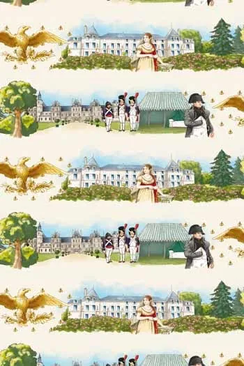 Dans le même esprit que nos tissus Paris et Versailles, celui-ci évoque la vie de Napoléon et Joséphine sous la forme d’une frise imaginaire. Vous trouverez Napoléon devant sa célèbre tente de campagne avec trois grognards, l’aigle impériale et les abeilles, l’Impératrice Joséphine devant la roseraie du château de la Malmaison et une vue du château de Fontainebleau.