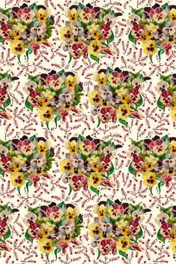 Coupon de tissu enduit Bouquet de pensées, motif floral principal.
