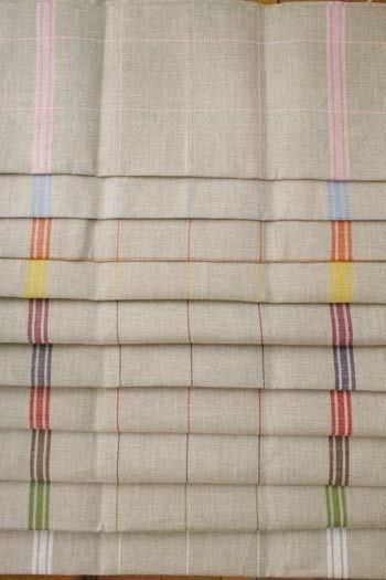Ces torchons sont tissés avec du lin nature brut. Ils reçoivent ensuite un traitement qui s’effectue par lots. Selon les lots, la réaction de rétrécissement n’est pas toujours la même, ce qui explique de petites différences de taille. Cependant, le nombre de FILS entre chaque quadrillage reste le même.