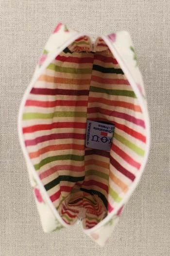 L’extérieur est dans notre toile cirée Les roses de Joséphine et l’intérieur dans son coordonné en coton à rayures.